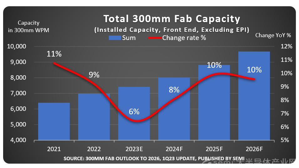 美国加州时间2023年3月27日,SEMI在《300mm晶圆厂展望报告-至2026年》(300mm Fab Outlook to 2026)中指出,全球半导体制造商预计2026年将增加300mm晶圆厂产能,达到每月960万片的历史新高。在2021和2022年强劲增长后,由于内存和逻辑元件需求疲软,预计今年300mm晶圆厂产能扩张将放缓。