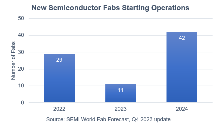 《世界晶圆厂预测报告》显示,从2022年至2024年,全球半导体行业计划开始运营82个新的晶圆厂,其中包括2023年的11个项目和2024年的42个项目,晶圆尺寸从300mm到100mm不等。